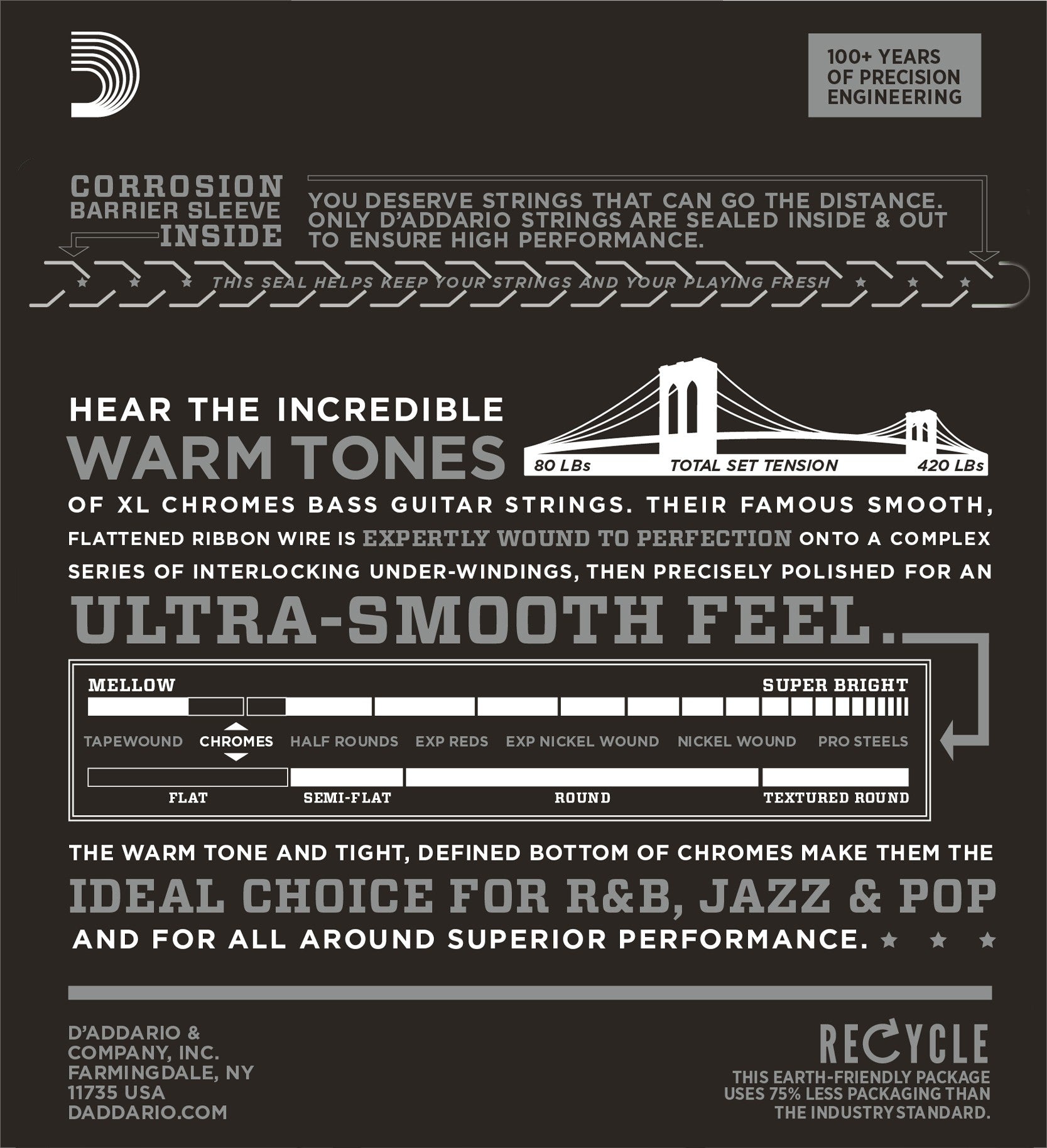 D'Addario Chromes Bass strings are wound with flattened stainless steel ribbon wire which is polished to an incredibly smooth surface. Delivering a distinctive damped, but tone-rich sound that only flatwounds can produce, D'Addario Chromes are the world’s most popular flatwound strings.