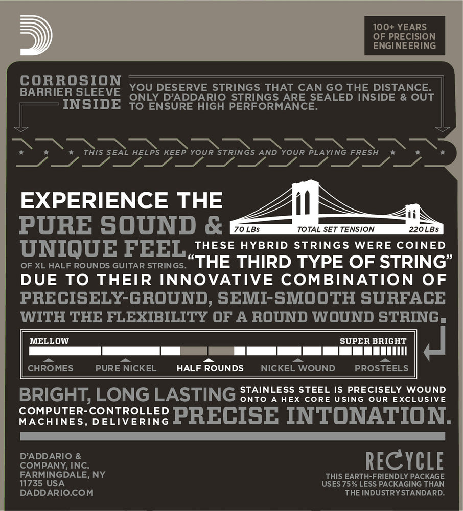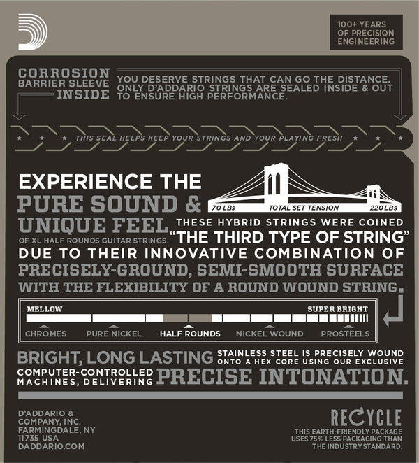 D'Addario Half Rounds Electric Guitar Strings are round wound with stainless steel and then precision ground leaving the outer surface smooth and “semi flat.” The result is a string with the tone and tension characteristics of round wound strings, with a smoother feel, similar to flat wound strings.