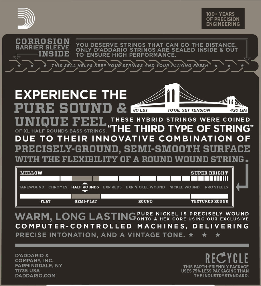 D'Addario Half Round bass strings are wound with pure nickel, then precision ground, leaving the outer surface smooth and semi-flat while retaining the flexibility of round wound strings. D'Addario’s exclusive heat treating process ensures that Half Rounds retain their round wound brightness and sustain.