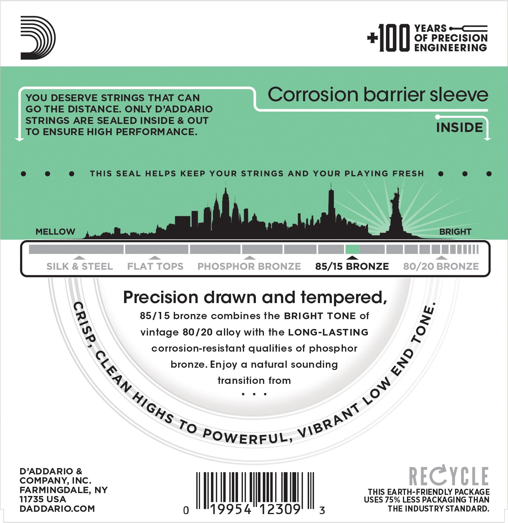 85/15 Bronze combines the brilliance of 80/20 bronze with the longer life characteristics of Phosphor Bronze. The 85/15 Bronze wrap wire is precision wound onto a carefully drawn, hexagonally shaped high carbon steel core, resulting in long lasting, bright sounding tone with excellent intonation.