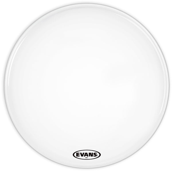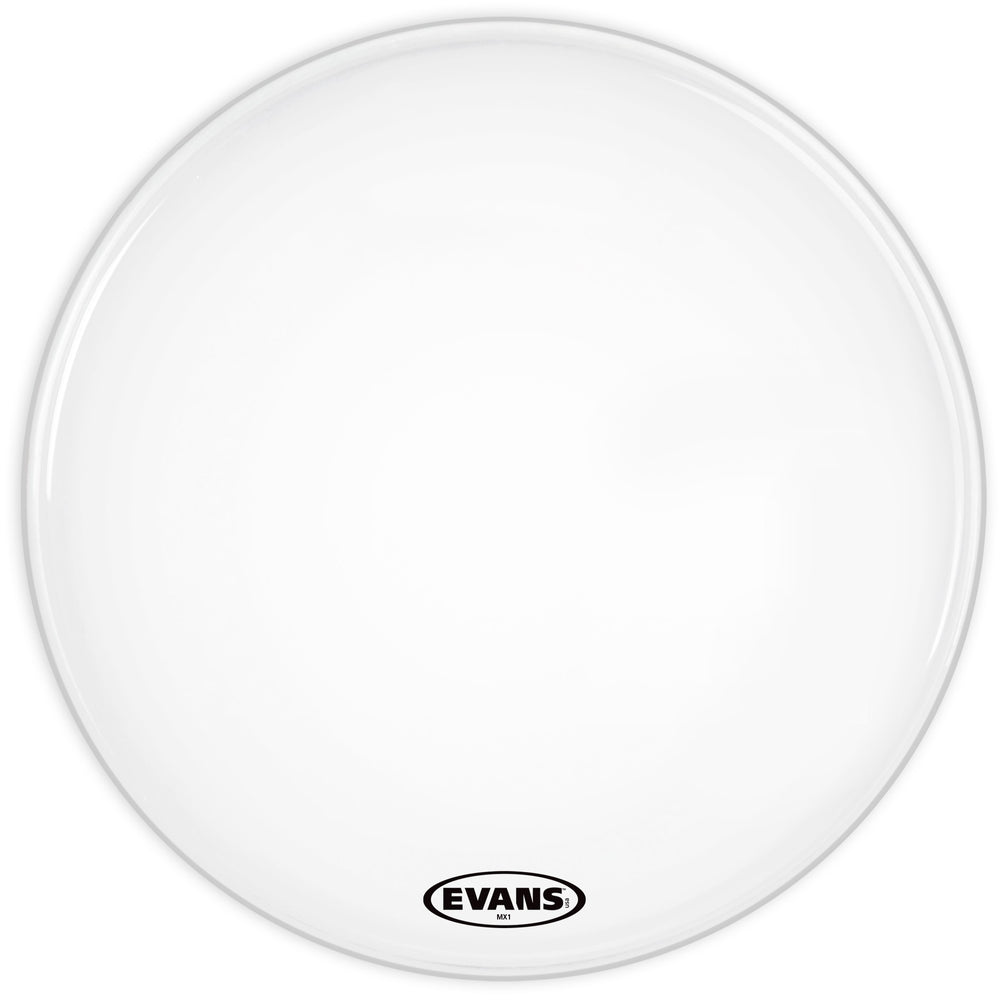 Evans MX1 white marching bass drum heads produces a bright, focused, and full tone with a single ply of 10mil film. The MX series includes a unique tone damping system that can be manipulated by applying individual felt arcs (included) to enhance articulation and focus low-end for both indoor and outdoor marching.